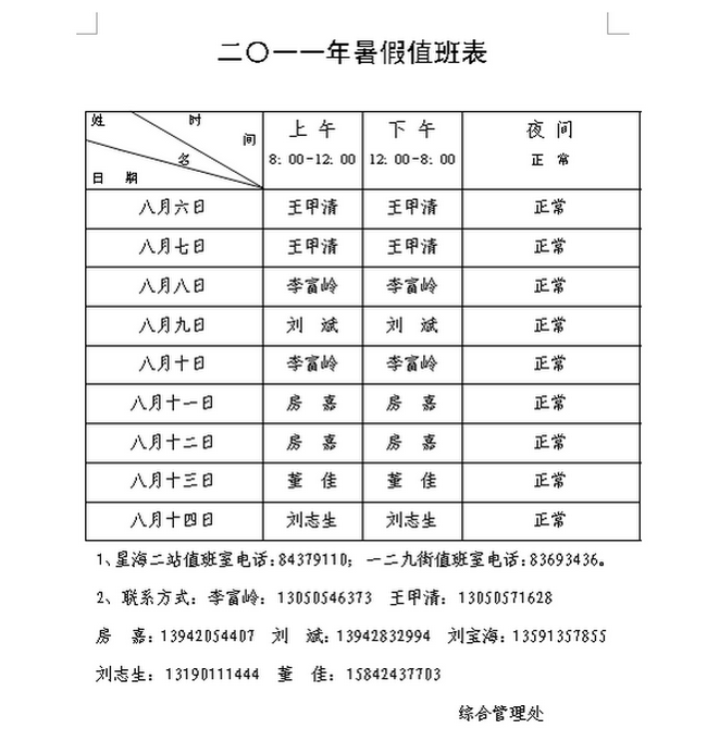 综合管理处2011年暑期值班安排