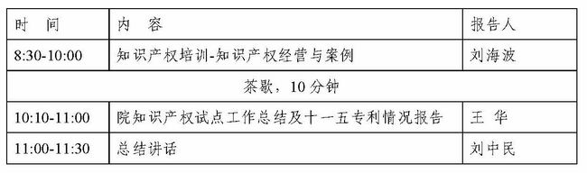 为推进我所知识产权工作向更深层次发展,提高知识产权管理水平,贯彻科学院十二五知识产权推进计划的指导思想,助推我所十二五科研布局的顺利进行,现决定召开大连化物所知识产权工作会议。