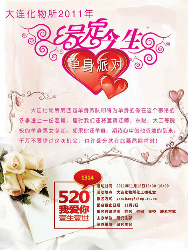 在这个浪漫的季节,您希望收获自己的浪漫爱情,或是温暖的友情吗?大连化物所第四届单身派对盛情邀请您的加入!在这里您将会找到属于自己的一份浪漫情感,一片缘分的天空!