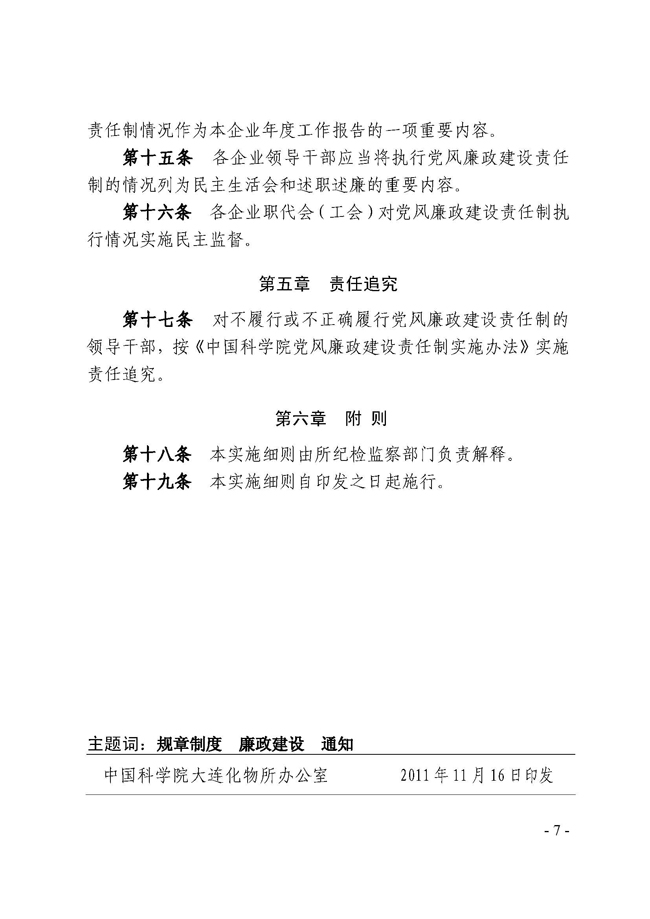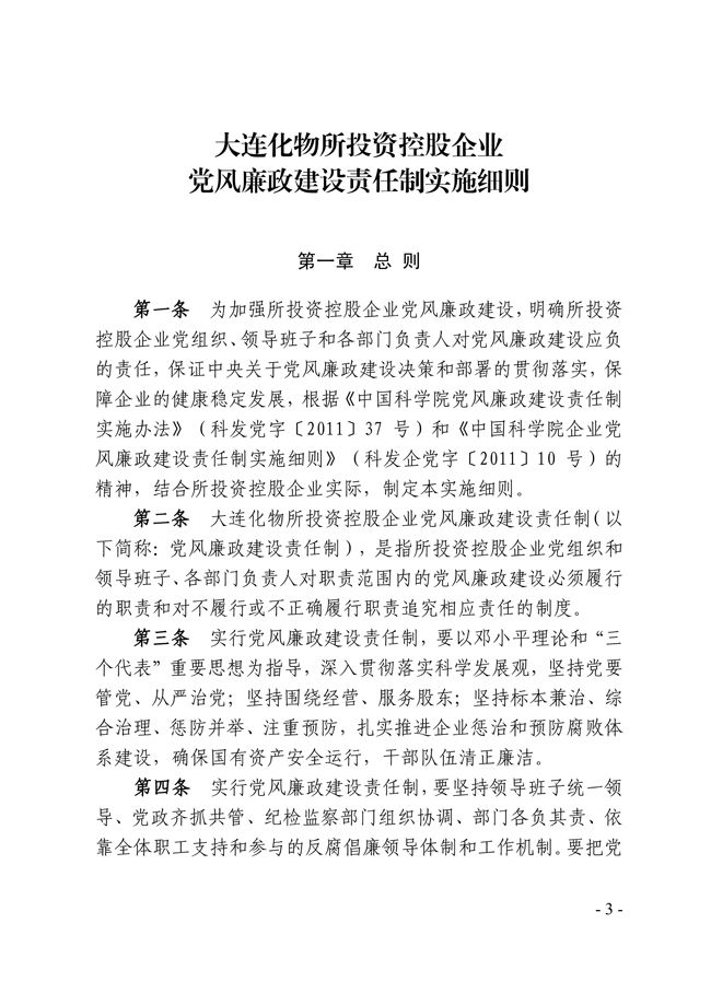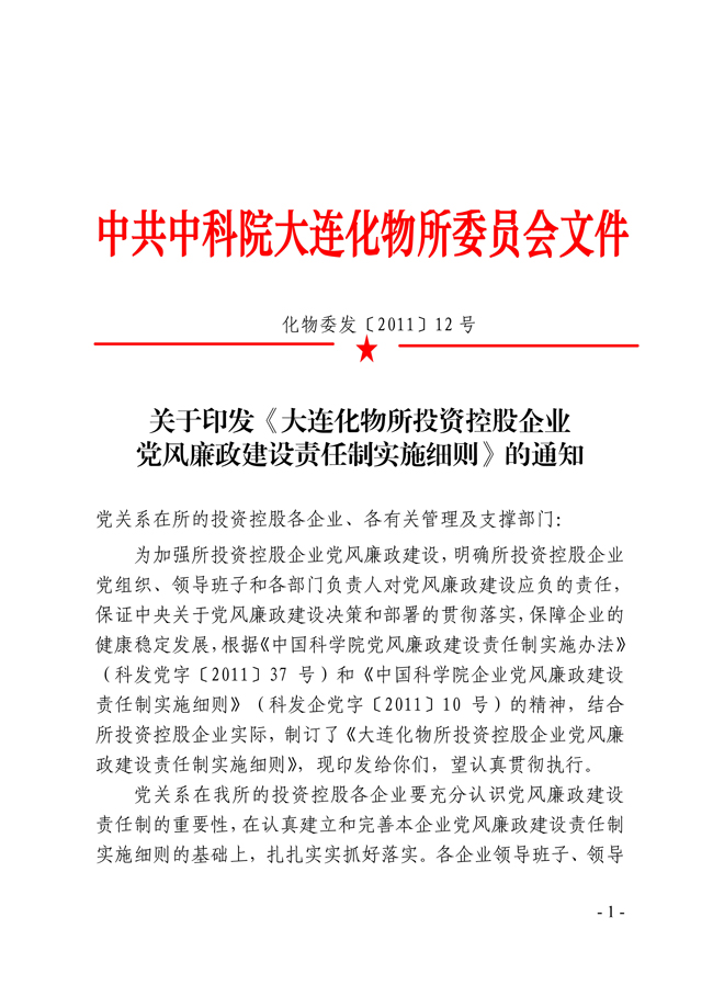 关于印发《大连化物所投资控股企业党风廉政建设责任制实施细则》的通知