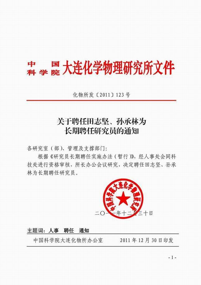 关于聘任田志坚、孙承林为长期聘任研究员的通知