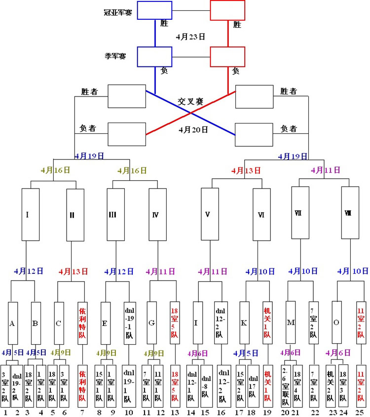 2、比赛时间:4月5日开始,每天中午12点比赛正式开始,超过比赛规定开始时间10分钟未到场者,视为弃权,判对方3:0胜;