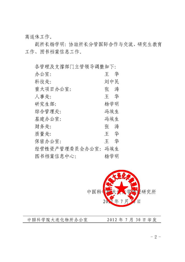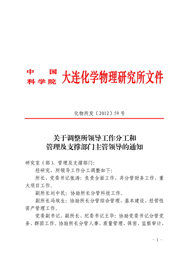 关于调整所领导工作分工和管理及支撑部门主管领导的通知