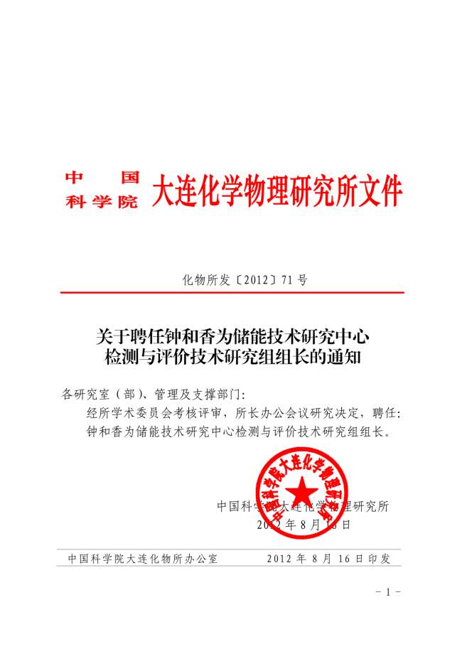 关于聘任钟和香为储能技术研究中心检测与评价技术研究组组长的通知