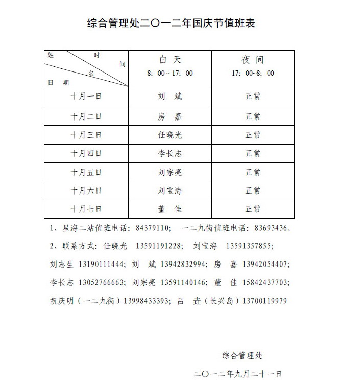 综合管理处二〇一二年国庆节值班表