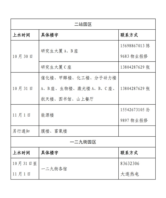 对于实验室内的重要仪器及设备,请各研究组提前做好防水措施,避免漏水带来损失。具体楼宇上水时间及联系方式如下: