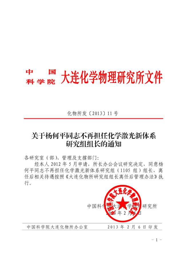 关于杨何平同志不再担任化学激光新体系研究组组长的通知