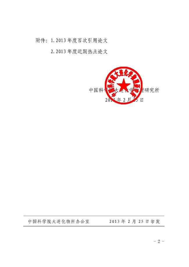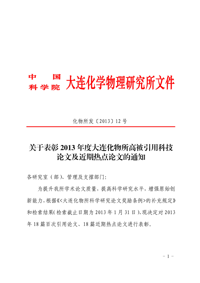 关于表彰2013年度大连化物所高被引用科技论文及近期热点论文的通知