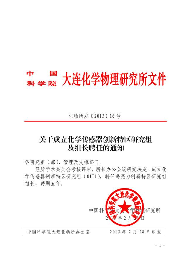 关于成立化学传感器创新特区研究组及组长聘任的通知