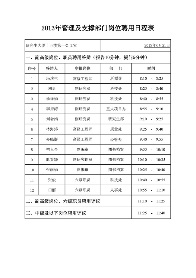兹定于6月21日召开2013年管理及支撑部门岗位聘用答辩会,进行副高级专业技术岗位、六级职员聘用评审,欢迎所内职工参加。