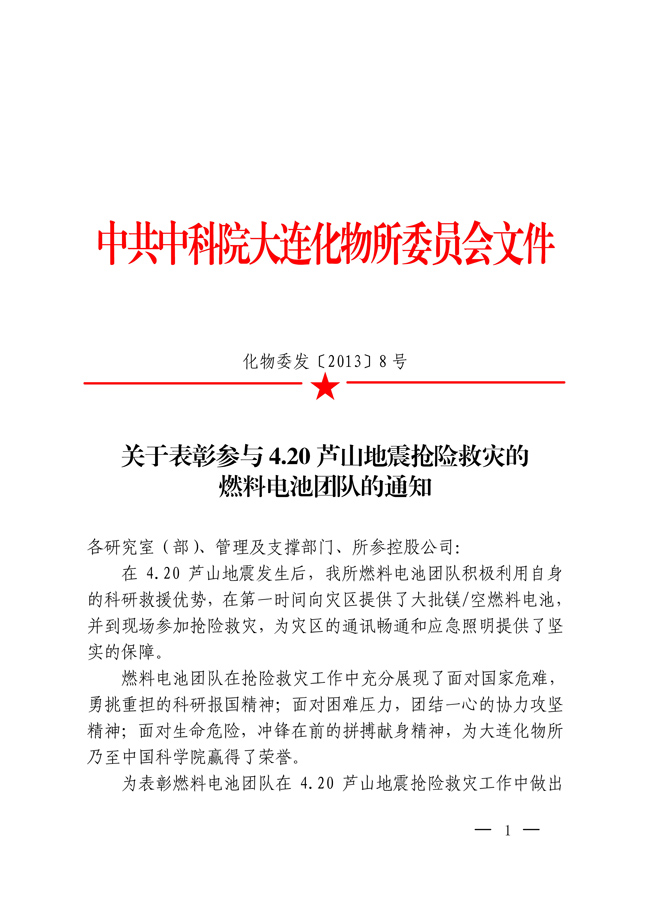 关于表彰参与4.20芦山地震抢险救灾的燃料电池团队的通知