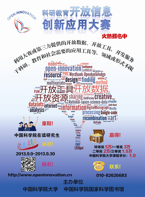 为支持广大研究生利用开放数据开展科研或教育创新,促进知识发现和知识应用,提高数字环境下的创新能力,推动创新型教育发展,中国科学院大学和中国科学院国家科学图书馆将于2013年9月9日至2014年1月20日联合举办“科研教育开放信息创新应用大赛”,现将相关事项通知如下: