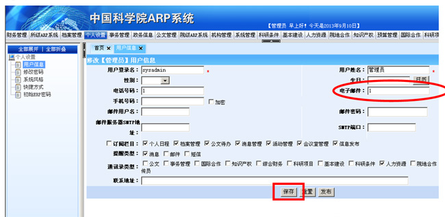 2、进入“个人设置-用户信息”菜单下,如下图所示。在“电子邮件”处维护个人邮箱,点击保存。