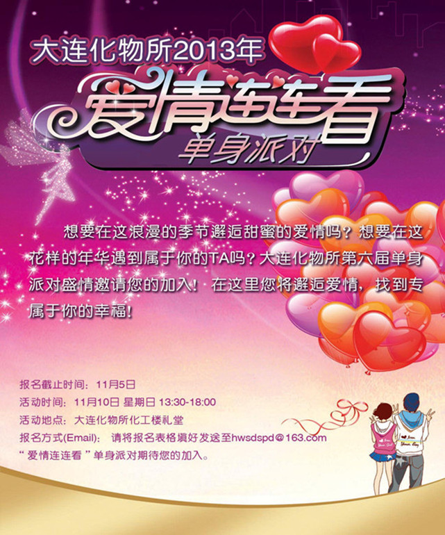 大连化物所第六届单身派对将于11月10日在化物所化工楼礼堂进行,为了促进化物所与兄弟院校单身青年之间的交流,我们将邀请辽师、大工、东财等兄弟院校的青年报名参加。届时将通过充分的交谈、热情的游戏、华丽的表演等方式增进相互了解。