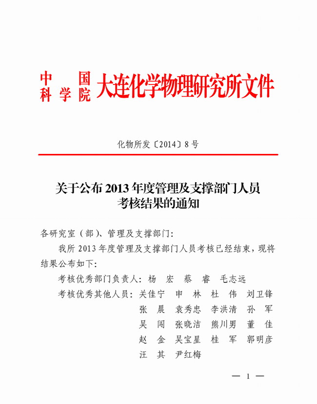 关于公布2013年度管理及支撑部门人员考核结果的通知
