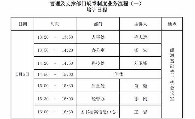 管理及支撑部门规章制度业务流程将分两讲进行介绍,第一讲培训日程如下:
