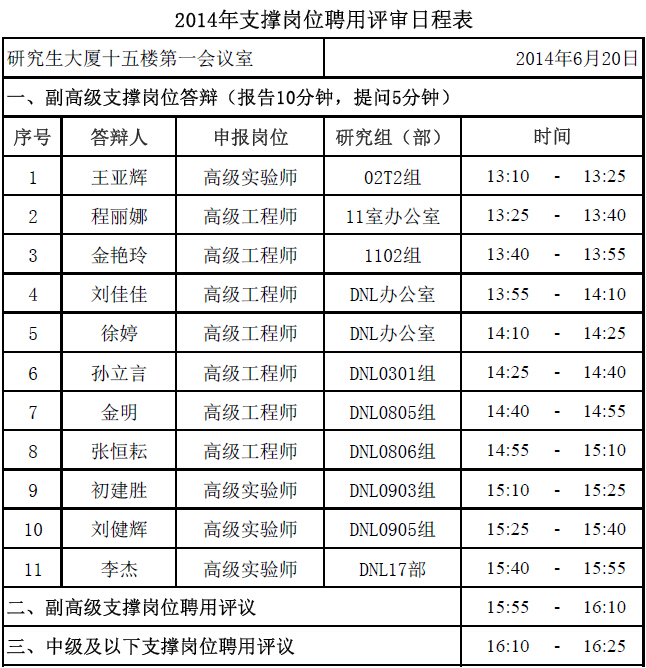 兹定于6月20日召开2014年支撑岗位聘用答辩会,进行副高级专业技术支撑岗位推荐评审,中级及以下专业技术支撑岗位评审。请参加答辩人员按照日程准时参加,欢迎所内职工参加。