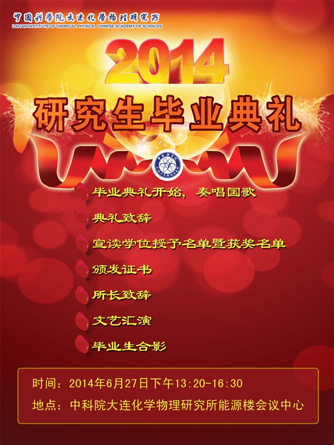 我所2014年研究生毕业典礼将于6月27日(周五)下午13:20在能源楼会议中心举行。届时所领导、我所导师、大连高校领导、优秀校友、设奖企业代表、毕业生代表、获奖学生代表以及研究生代表等将出席典礼。为保证毕业典礼按时顺利举行,请参加毕业典礼的毕业生代表、获奖学生以及研究生代表12:50-13:00入场,对号入座。