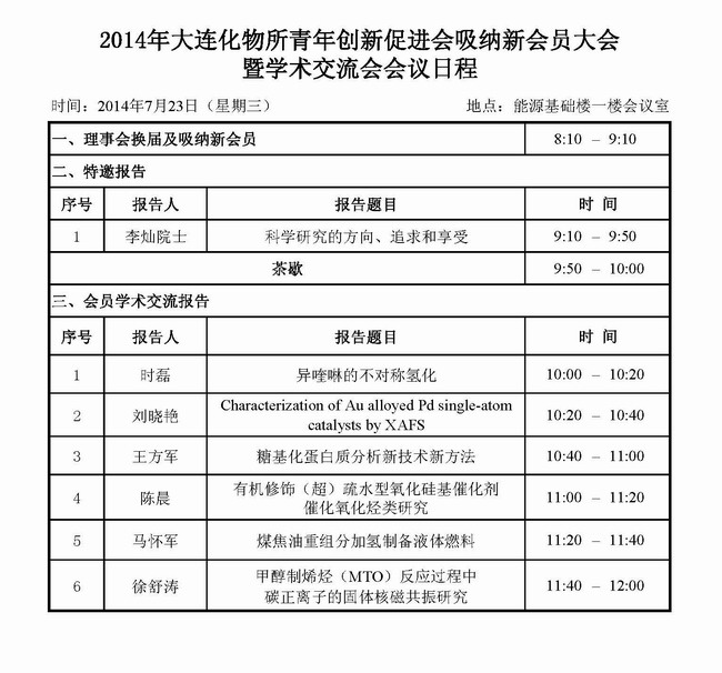 兹定于7月23日(周三)8:00-12:00在能源基础楼一楼会议室(原膜楼)举行2014年大连化物所青年创新促进会吸纳新会员大会暨学术交流会。