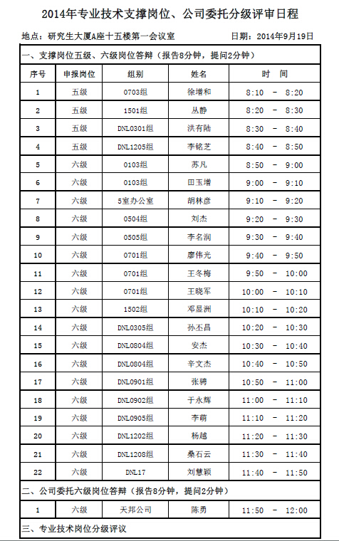 兹定于9月19日召开2014年专业技术支撑岗位及公司委托分级评审答辩会,进行五级、六级支撑岗位推荐评审,八级、九级、十一级支撑岗位评审。请参加答辩人员按照日程准时参加,欢迎所内职工参加。