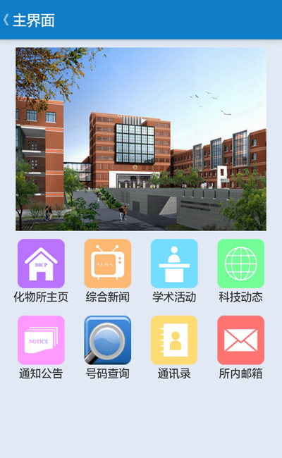 大连化物所手机移动办公系统由信息中心和学生志愿者自行开发。该系统计划集成办公功能(综合新闻、学术活动、科技动态、通知公告、所内邮箱)、学习功能(移动图书馆、电子资源跨库检索、IR知识库、网上报告厅)、二维码识别、生活功能(网上报告厅、日程管理、会议室管理、开户行信息、酒店会议中心信息、律师在线、研究生心理健康咨询)于一体。目前,第一阶段开发已经完成,功能如下图所示:包含所内邮箱邮件收发、电话号码查询、通知公告、学术活动、综合新闻、化物所主页链接。