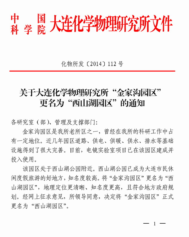 关于大连化学物理研究所“金家沟园区”更名为“西山湖园区”的通知