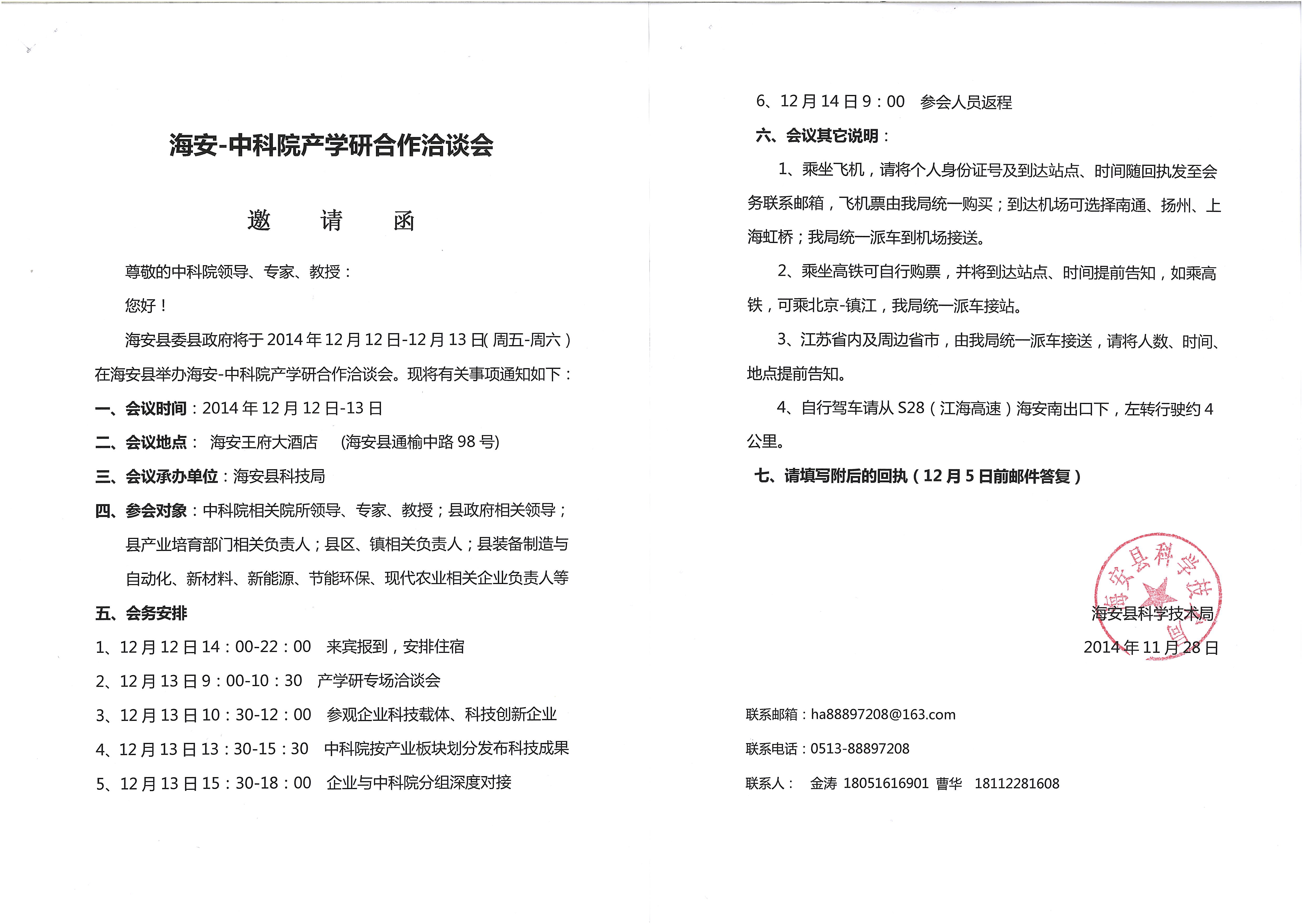 为加强中科院创新科技成果在苏转移转化,江苏海安县政府特邀我院专家于12月12日至13日赴当地参加中科院-海安产学研对接会,届时将有数百家企业参与化工新材料、能源环保、现代农业等领域的专场成果发布会和合作洽谈活动。欢迎相关研究组派员出席本次活动,并作十分钟的成果发布PPT,积极寻求合作契机。当地政府为本次活动提供交通、住宿支持,活动事宜详见附件。请于12月4日前反馈参会回执,我们将积极做好筹备、服务工作。