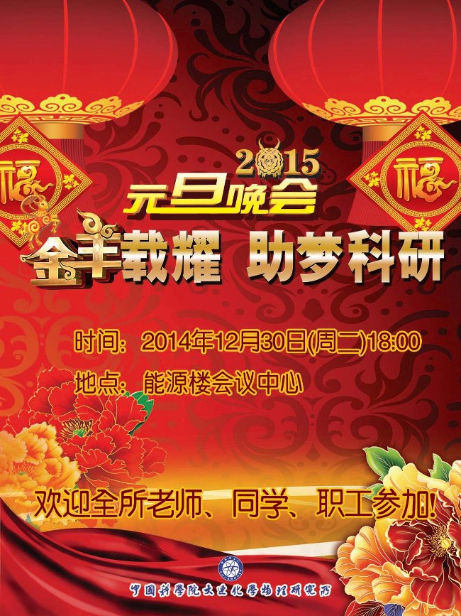 为迎接新年的到来,营造活泼欢快的节日气氛,为我所师生提供一个展示自我风采的舞台,使大家在欢声笑语中结束一年的辛勤工作,我所研究生会、研究生部特举办“金羊载耀,助梦科研”新年晚会。与您相约12月30日(周二)18:00,能源楼会议中心,精彩的文艺演出,丰富的抽奖礼品,敬请期待!