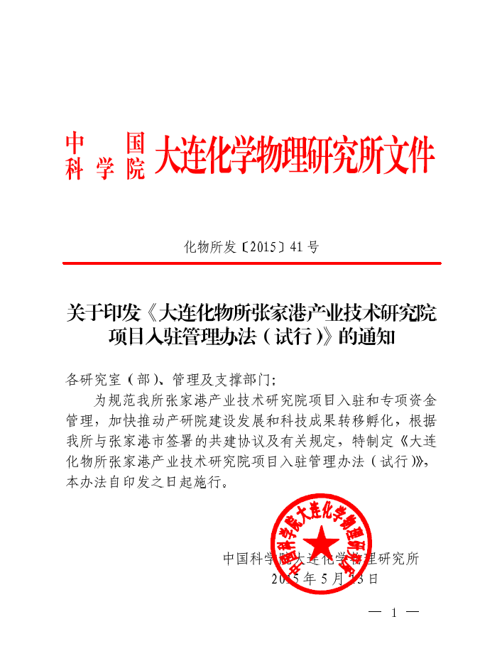关于印发《大连化物所张家港产业技术研究院项目入驻管理办法(试行)》的通知