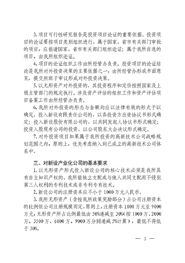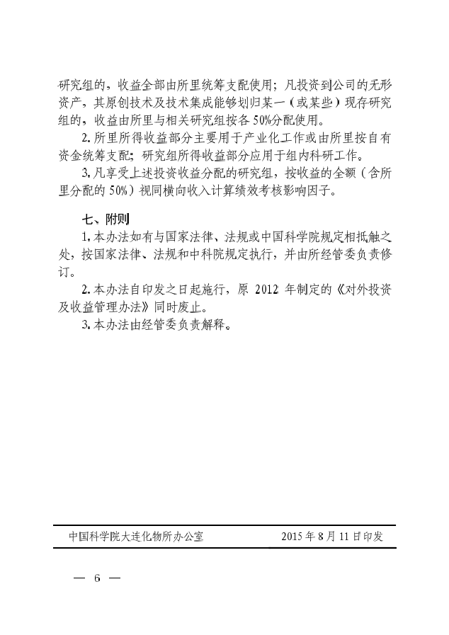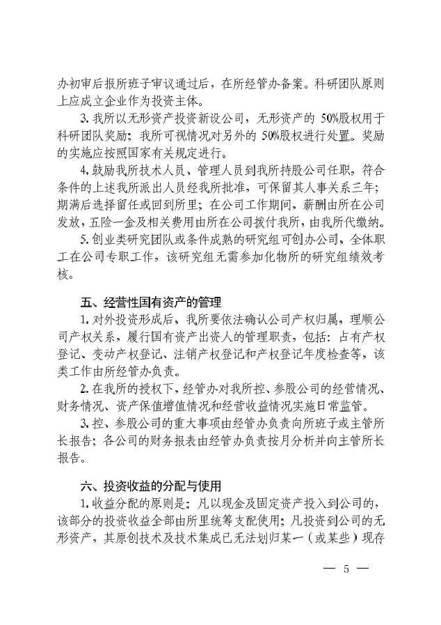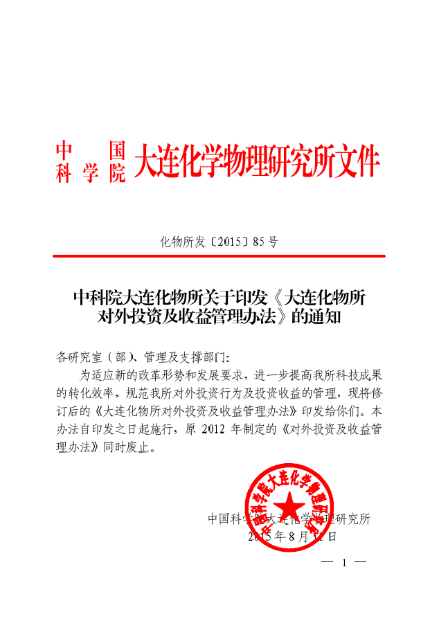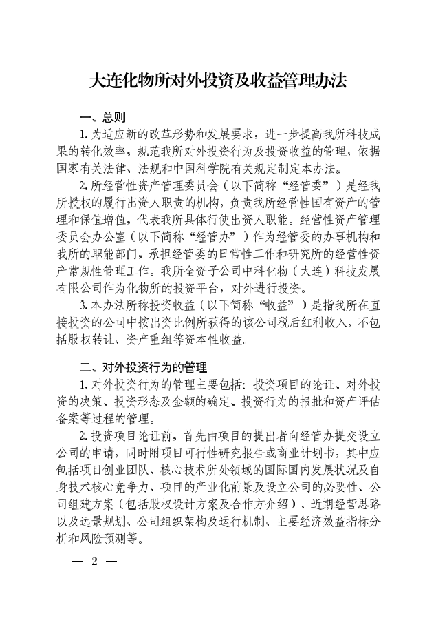 中科院大连化物所关于印发《大连化物所对外投资及收益管理办法》的通知
