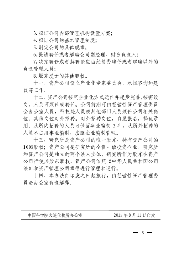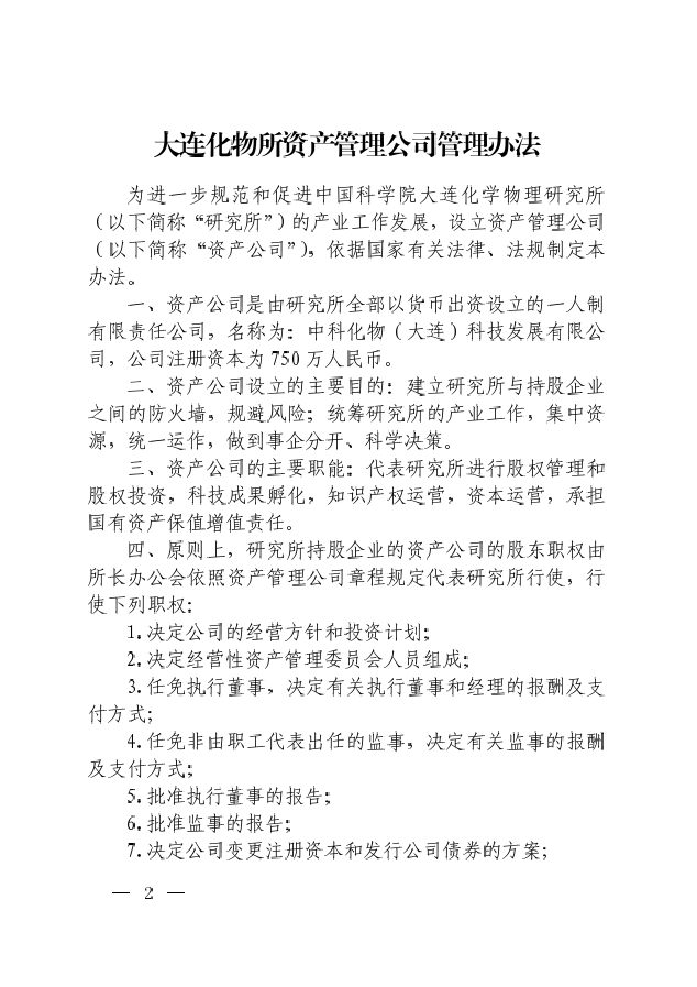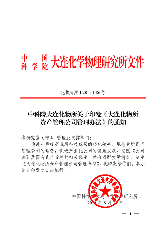 中科院大连化物所关于印发《大连化物所资产管理公司管理办法》的通知