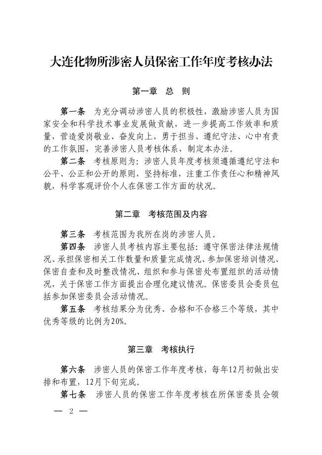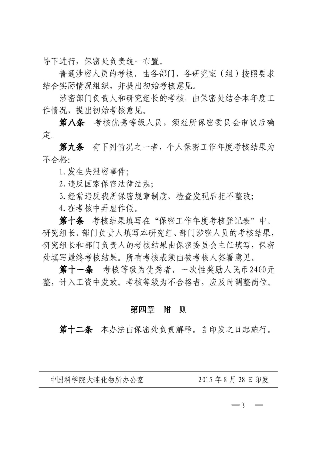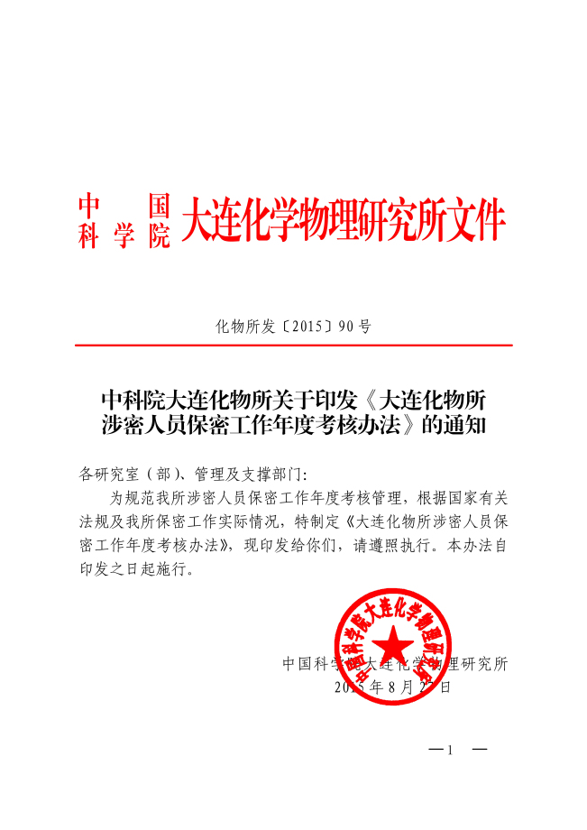 中科院大连化物所关于印发《大连化物所涉密人员保密工作年度考核办法》的通知
