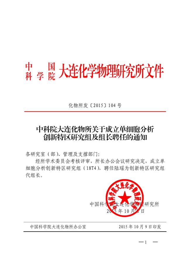 中科院大连化物所关于成立单细胞分析创新特区研究组及组长聘任的通知
