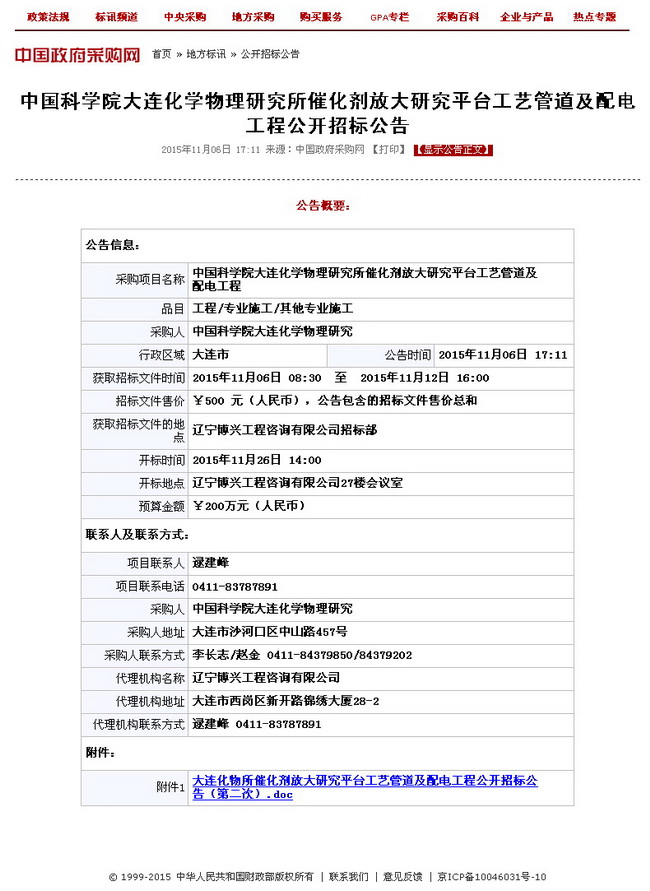 大连化物所催化剂放大研究平台第五批设备安装工程(工艺管道及配电部分)已具备招标条件,正在进行招标,招标公告的网址及详细内容如下,望周知。
