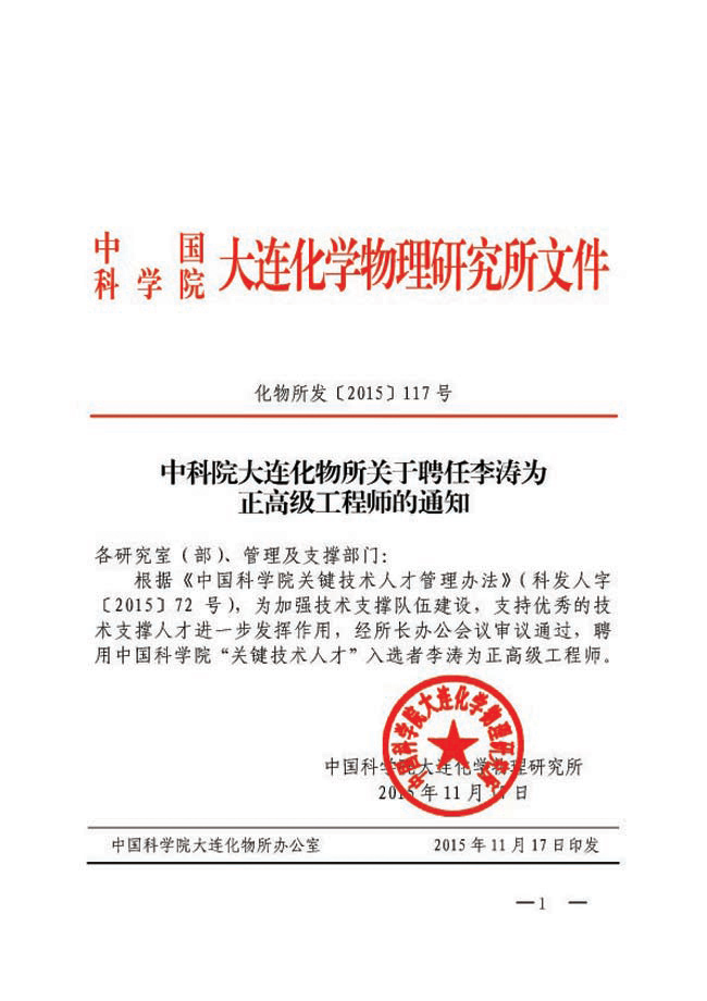 中科院大连化物所关于聘任李涛为正高级工程师的通知