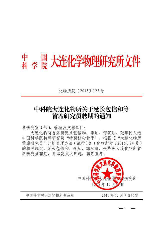 中科院大连化物所关于延长包信和等首席研究员聘期的通知