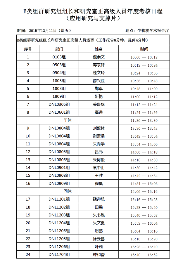 B类组群研究组组长和研究室正高级人员年度考核日程(应用研究与支撑片)