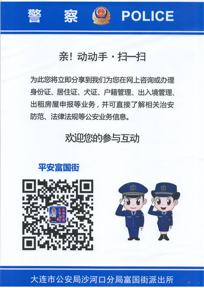 近日,大连市公安局沙河口分局富国街派出所公布手机二维码应用,只要“扫一扫”二维码,即可在该网站上咨询或办理身份证、居住证、户籍管理、出入境管理等业务,并可直接了解相关治安防范、法律法规等公安业务信息。