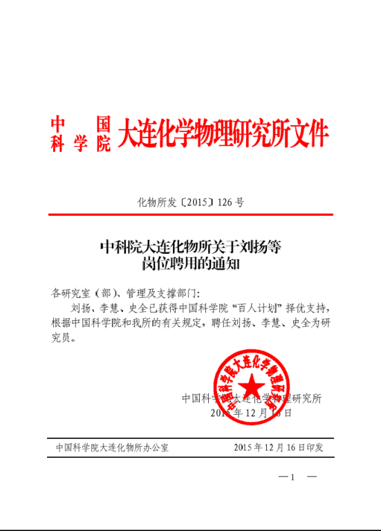 中科院大连化物所关于刘扬等岗位聘用的通知