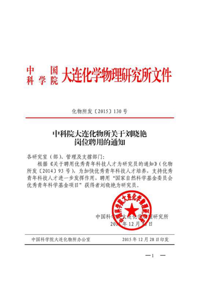 中科院大连化物所关于刘晓艳岗位聘用的通知