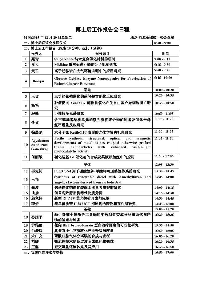 兹定于12月29日(周二)8:30至17:00在能源基础楼一楼会议室举行2015年度博士后工作报告会,会议组织将博士后联谊会换届仪式、评选2015年度“优秀博士后工作报告奖”,欢迎所内职工及研究生参加。