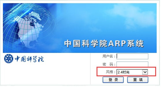 根据中科院的统一部署,我所已经完成了ARP系统V2.4版本的升级。V2.4版本和V2.3版本在界面风格上存在较大差异,如不适应新版本的操作方式,可以在登录时对界面风格进行自主选择,方法如下图所示: