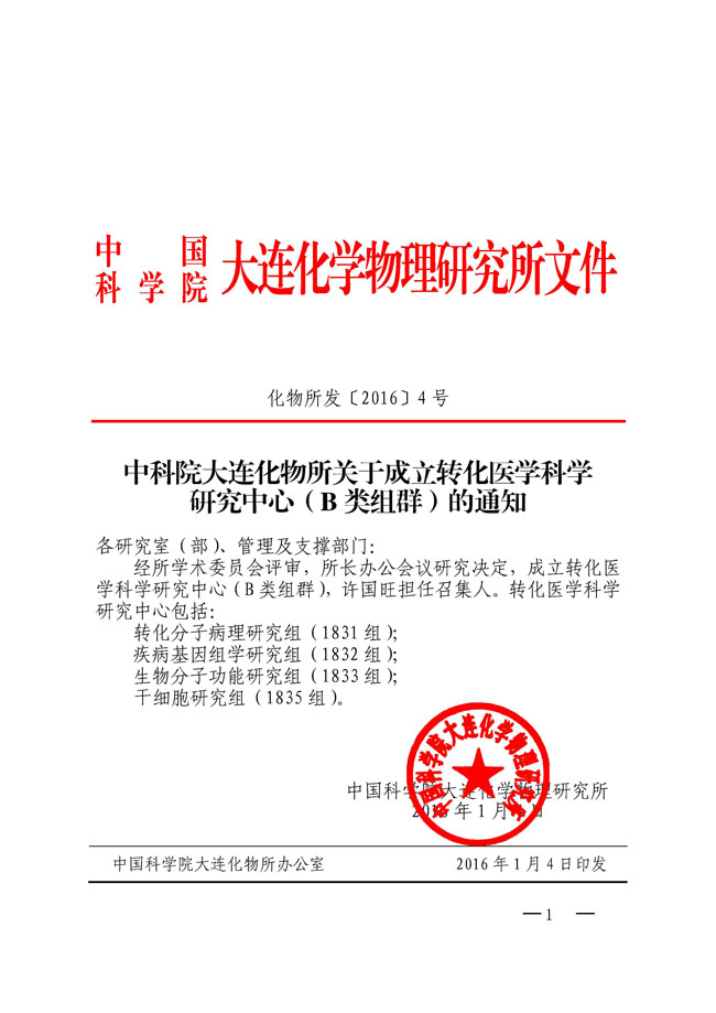 中科院大连化物所关于成立转化医学科学研究中心(B类组群)的通知
