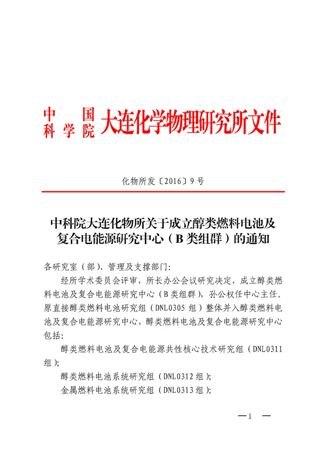 中科院大连化物所关于成立醇类燃料电池及复合电能源研究中心(B类组群)的通知