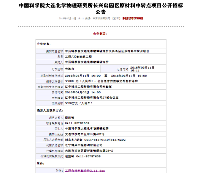 中国科学院大连化学物理研究所长兴岛园区原材料中转点项目拟进行公开招标,招标公告的网址及详细内容如下:http://www.ccgp.gov.cn/cggg/dfgg/gkzb/201603/t20160311_6579244.htm