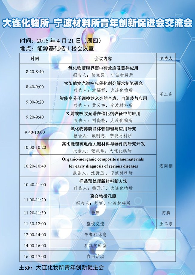 为促进我所与宁波材料所青年学者之间交流,加强学科交叉融合,我所特举办大连化物所-宁波材料所青年创新促进会交流会。现将有关事宜通知如下: