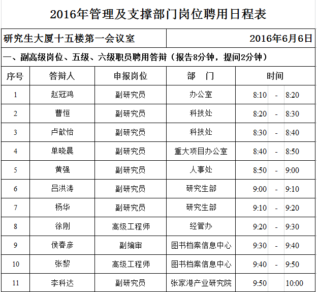 兹定于6月6日召开2016年管理及支撑部门岗位聘用答辩会,进行副高级专业技术岗位、五级、六级职员岗位聘用评审,欢迎所内职工参加。