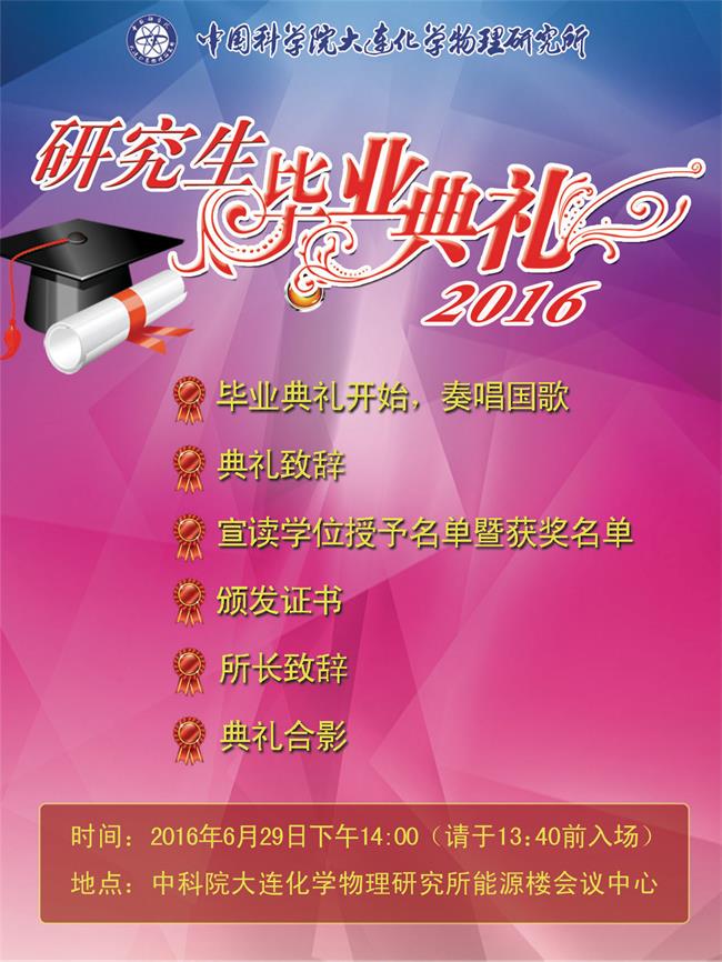 我所2016年研究生毕业典礼将于6月29日(周三)下午14:00在能源楼会议中心举行。届时所领导、我所导师、大连高校领导、优秀校友、设奖企业代表、毕业生代表、获奖学生代表以及研究生代表等将出席典礼。为保证毕业典礼按时顺利举行,请参加毕业典礼的毕业生代表、获奖学生代表以及研究生代表于13:30至13:40入场,对号入座。