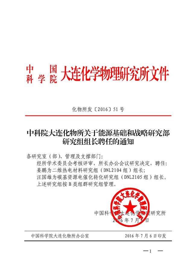 中科院大连化物所关于能源基础和战略研究部研究组组长聘任的通知