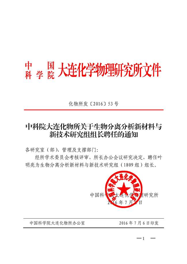 中科院大连化物所关于生物分离分析新材料与新技术研究组组长聘任的通知